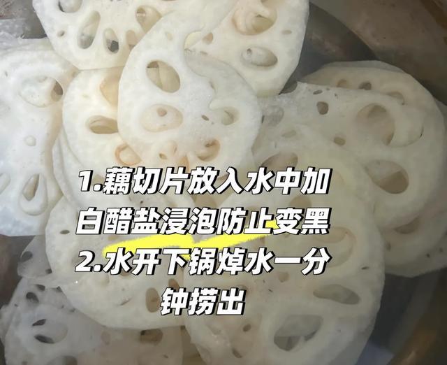 但是自己做就没那味,后来上网查,原来藕片要先放在加了白醋和盐的水里焯一分钟,会脆许多,还能防止变黑。