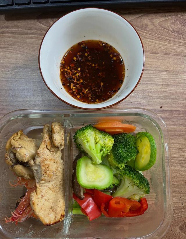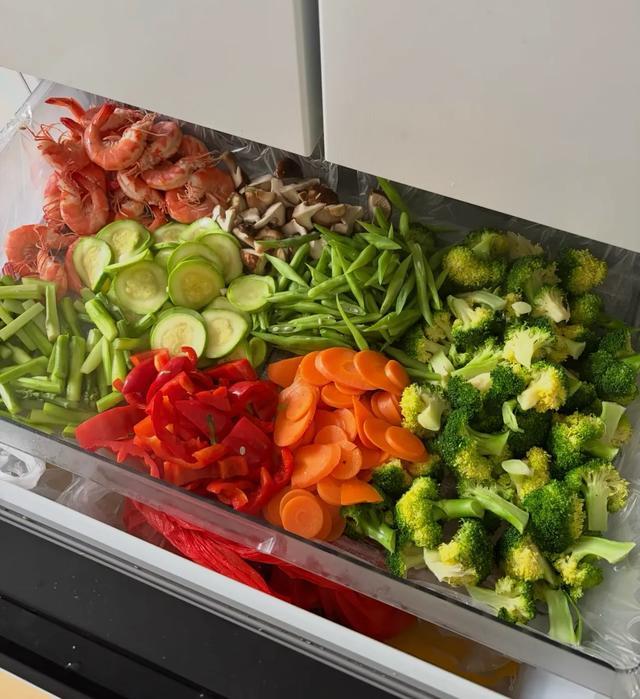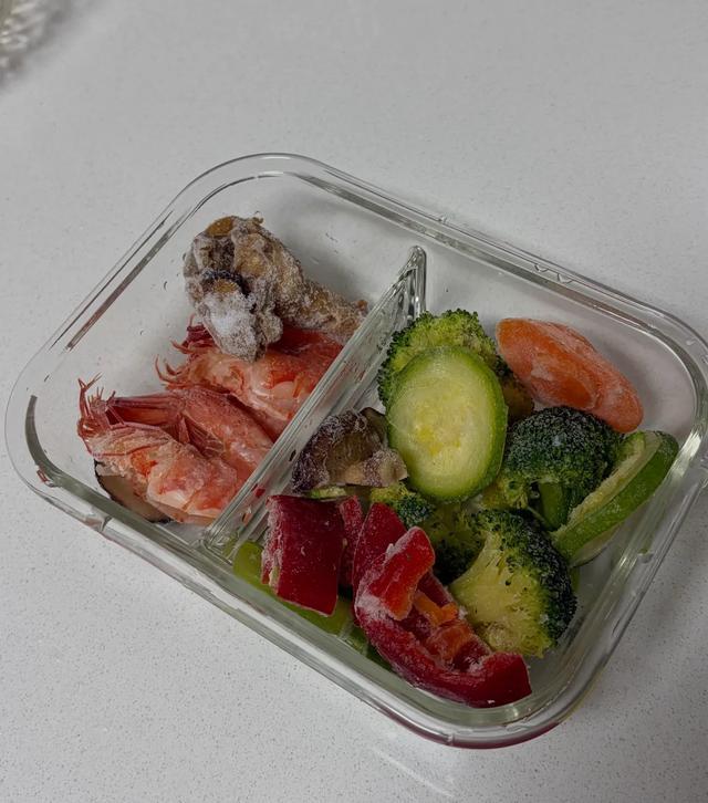 趁着周末,把虾一次性煮熟,各种蔬菜焯水后切好,然后拿保鲜盒或者保鲜袋分装好,直接冷冻保存,就是一周的减脂预制菜了!