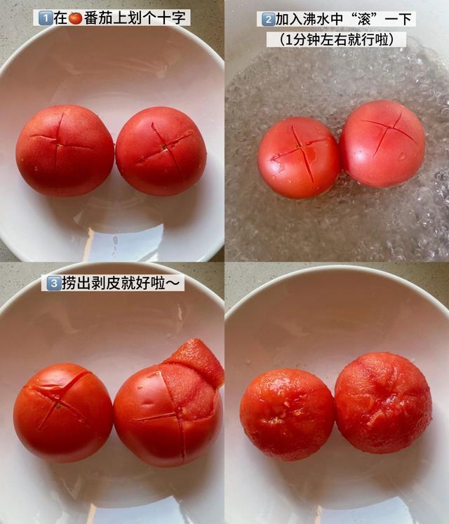 先在番茄屁股上划个十字,然后放进沸水里滚1分钟;