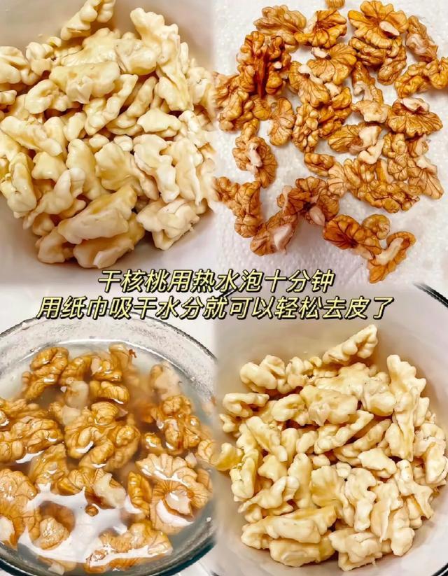 核桃仁也是,很多人不爱吃那层涩涩的薄皮,这个不用烫,用热水泡个十分钟就行,捞出来用纸巾吸干水分,皮一搓就掉了。