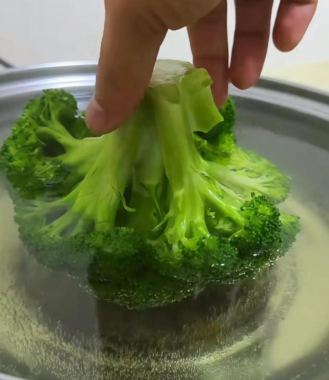 说到焯西兰花,剁了多麻烦,有个方法能省力不少:诶,你这么倒着,让西兰花头栽锅里,或者用根筷子穿起来,架在锅沿上,手就不酸了。